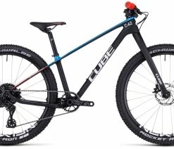 The full carbon frame and fork are just the lightweight start. CUBE fitted Advent X 1×10 gears for their easy shifting, wide range and simple reliability. There’s a headset limiter to prevent top tube damage in the event of a crash. A 12×100 thru axle up front and child-sized handlebars, grips and brake levers – with hydraulic discs – ensure accurate control at all times. And little touches like the ultra-lightweight Schwalbe Aerothan inner tubes and Newmen wheels are just the kind of details you’d expect from a thoroughbred.