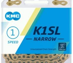 La chaîne singlespeed KMC K1SL Narrow avec surface revêtue de Titan Nitrid Gold pour BMX, système de moyeu à vitesses intégrées et autres systèmes singlespeed nécessitant une transmission directe de la puissance.