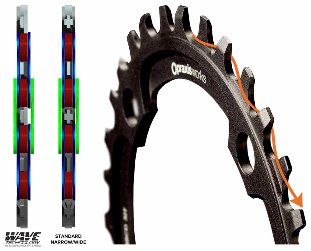 Licencié et développé en collaboration avec Mountain Racing Products, le profil de dent à motif Wave™ applique une force latérale alternée à chaque maillon de la chaîne pour retenir activement la chaîne à l’anneau – allant au-delà des implémentations étroites/larges qui reposent uniquement sur la friction, tout en laissant de la place pour que la boue, les débris et les gravillons s’échappent. La conception Wave™ s’use également plus lentement que les conceptions concurrentes en répartissant la charge sur de plus grandes surfaces.